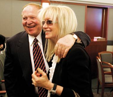 Sheldon Adelson in District Court on April 17, 2008, with his wife, Miriam, who during the trial helped the then-74-year-old casino mogul to the witness stand.