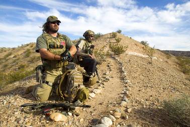 Reid Hendricks of Camden, Tenn., and Jim (no last name provided) of Las Vegas take up a position on a hill by Cliven Bundy’s ranch near Bunkerville on Tuesday, April 15, 2014. Hendricks is a former Marine (honorably discharged) and has worked as a police officer and a high school history teacher, he said.