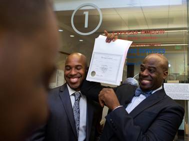 Sherwood Howard Jr., and Nevada state Sen. Kelvin Atkinson show off their marriage certificate at the Clark County Marriage License Bureau on Thursday, October 9, 2014.
