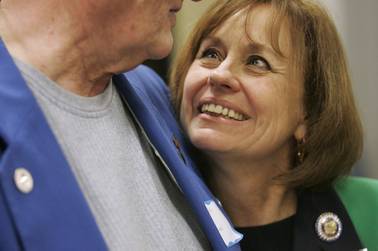 U.S. Senate candidate Sharron Angle gets a hug from Fallon City Councilman John Tewell after a Lincoln Day dinner in February. Angle was endorsed last week by the Tea Party Express, but the former Nevada legislator faces an uphill climb in a 12-candidate GOP primary field.