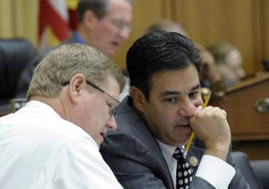 House Judiciary Committee members Rep. Raul Labrador, R-Idaho, right, and Rep. Mark Amodei, R-Nev. talk on Capitol Hill in Washington, Wednesday, May 22, 2013, during the committee’s hearing on immigration reform.