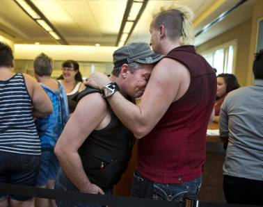 Morgan Floyd is consoled by David Parry after being refused a license from the county’s Marriage License Bureau in downtown Las Vegas, Wednesday, Oct. 8, 2014. Many couples waited for hours but left disappointed.