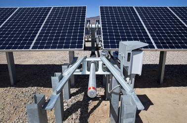 A view of a tracking system at the SunPower Boulder Solar 1 Facility in Boulder City Tuesday, April 18, 2017. The system adjusts the angle of the panels relative to the sun throughout the day for maximum efficiency, a representative said.