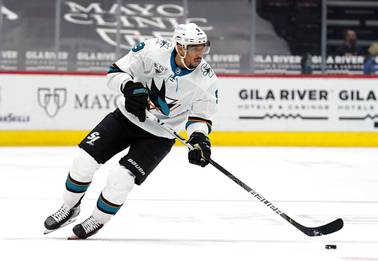 In this March 26, 2021, file photo, San Jose Sharks left wing Evander Kane moves the puck during the team’s NHL hockey game against the Arizona Coyotes in Glendale, Ariz.