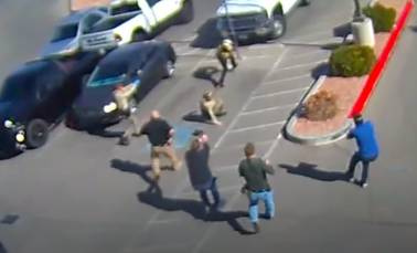 In a screen grab, a man who attacked a Metro Police officer outside a Las Vegas gun range is shown being shot.