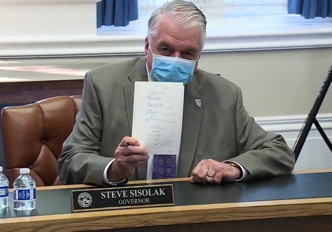 Nevada Gov. Steve Sisolak signs unemployment insurance legislation during a press conference, Thursday, Aug. 6, 2020. Photo by screenshot