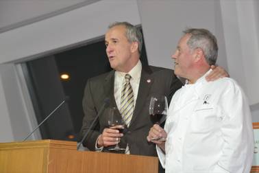 Chef Wolfgang Puck, right, with Larry Ruvo, launches four wines to benefit Keep Memory Alive.